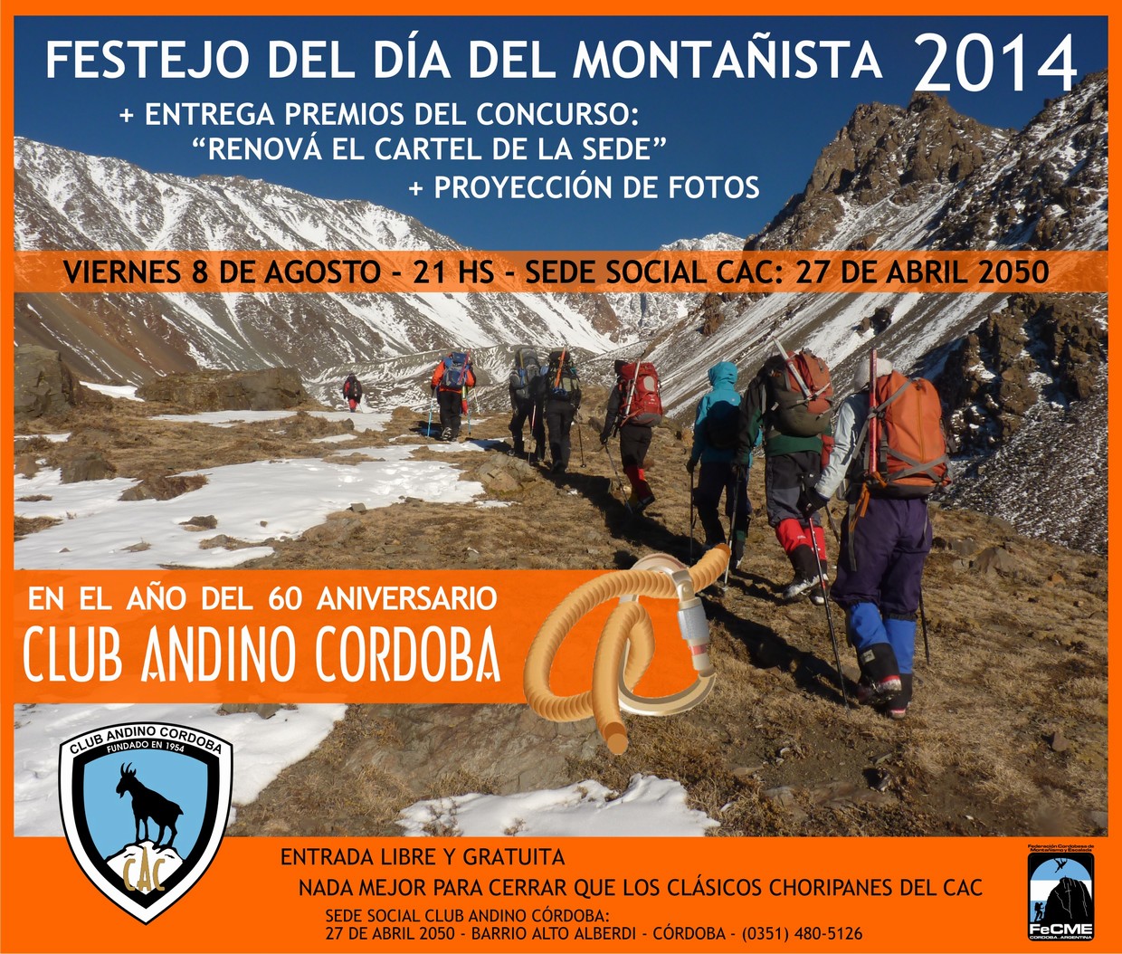 Este el viernes 8 de agosto nos reunimos a festejar, a nuestro estilo, el día de la Montaña. En esta oportunidad, y celebrando también el regreso de la ETM a nuestro club, veremos fotos de lo que fue el fantástico curso que se dictó este año. Además, preparándonos para el 60º Aniversario, tendremos los resultados del concurso de renovación del cartel que adornará nuestra sede, y haremos la entrega de los premios correspondientes.